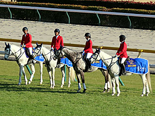 メインレースの 誘導馬。 今日は タケルペガサス、 サクセスミノル、 サトノソルタス、 ミライヘノツバサの4頭が務めていました。 |