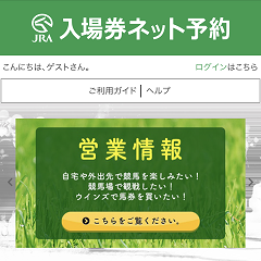 (1)立見入場券の事前抽選発売で予定数に満たなかった場合、 1回前の水曜日18:00から残券が先着発売されます。 (2)「JRA入場券ネット予約」にログイン後、残券表示があった場合のみ購入可能です。 |