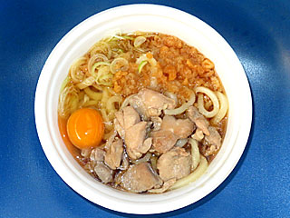 (うどん、鶏肉、生卵、天かす、ネギ)