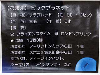本日、 ホースリンクで展示されていたのは ビッグプラネット。 2005年2月13日にデビュー勝ちし、続いてGⅢアーリントンCも連勝。 皐月賞は6着、 NHKマイルCは5着。 その後、4歳時に京都金杯を勝って重賞2勝目。 しかし、昨年の 毎日王冠14着と惨敗した後、11/2に登録抹消。 父はブライアンズタイム、母はロンドンブリッジ。良血!! |