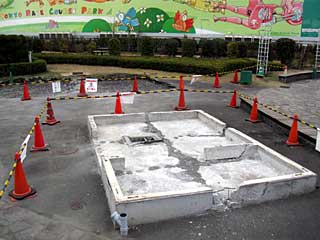 バラ園付近に残っていた売店の簡易店舗。 東京競馬場がリニューアルする以前、ここでラーメン屋などが営業をしていたが、リニューアル後は閉鎖され、数年間放置されたままだった。 その簡易売店も遂に撤去。 遺構が残るのみになっていた。 |  |  |