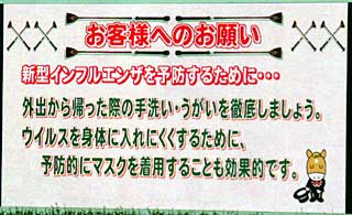 現在、メキシコから世界中へ 新型インフルエンザ( 豚インフルエンザ)の感染が大流行しています。 ターフビジョンでも予防のお知らせが。。。 これまた異例のこと。 |