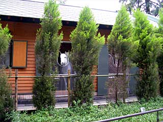 同じく ホースリンクの厩舎裏側から、 アルスブランカが顔を出してました。 厩舎裏側は木が植えられていて、馬も顔をなかなか出してくれないし、木々の隙間から顔を伺うのも難しいのですが、ポーズまで決めてくれました! |  |  |