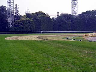 いよいよ 芝コース開放!! とりあえず4コーナー方向へ。 さっきレースが終わったばかりなのに、もう仮柵の撤去作業が始まってました。 |