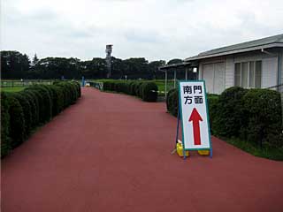 最後に 芝コース。 向こう正面の芝コースに入るのは、2002年6月9日に行われた東京芝2400m本馬場開放「 ファイナルダービー」以来だ! で、この芝コースを横断すると 南門に到着。 けど、到着後、すぐさま引き返す。 |  |  |