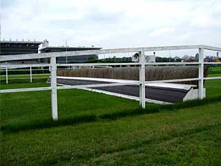 障害コースを横断すると、仮設通路はダートコースと障害コースの間を東へ進むかたちになってました。 ちょうど真横に見えたのは 第5号竹柵障害。 |