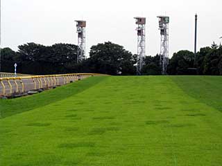 芝コースを横断中。 向正面から3コーナー方面を見たところ。 その直後、どこからともなく鳥の大群がやってきた! 芝コースはあっという間に鳥で埋め尽くされる。 レース中なら大変なことだ! |  |  |