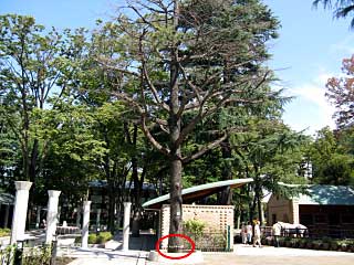 ローズガーデンを歩いている最中、 ヒマラヤシーダーの根元に見慣れぬ光景が。 どうやらこの木は弱っているらしく、 樹木活力素なる薬が投与されてました。 確かに周りの木は葉をいっぱい蓄えているが、この木だけ、常緑樹であるはずなのに葉っぱが1枚も付いてない。 元気に回復してくれることを祈るばかり。 |  |  |