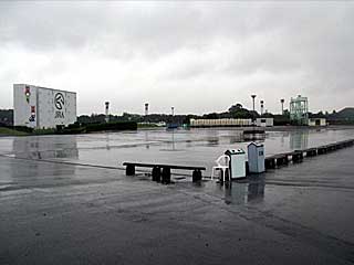 今度は内馬場へ。 馬場内東エリアがいよいよ開放されました。 といっても何もない。ベンチがいくつかあるだけ。 馬券売場どころか、モニターすらない。 おまけに雨が降っていることもあり、当然、誰もいませんでした。 |