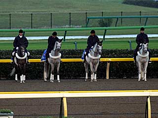 開催初日の 誘導馬たち。 左から キモンホワイト、 カフェベネチアン、 マチカネリュウセイ、 マイネルグレーカ。 キモンホワイトが誘導している姿を見たことないので、今日が誘導馬デビューかな? |