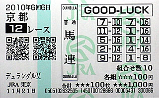 京都最終レースは 京都スマイルプレミアム・ デュランダルメモリアル。 デュランダルは2003,2004年の マイルCSを連覇した馬。 サンデーサイレンス産駒を代表する名マイラー。 今回も記念に JRAクイックピックを購入したがハズレ。 |