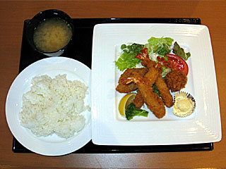 その後、昼食。 レストランプラザの 「マツヤサロン」へ。 「 シーフードフライ」を注文。 内容はエビフライ3尾、白身魚フライ、ホタテフライ。 エビはプリプリ! フライのころももサクサクでおいしい! けど、ご飯がちょっと冷たかったのが残念。 |
