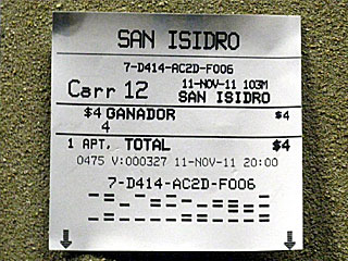 馬券は海外ではお馴染みのレシートタイプ。 ちなみに写真は、12Rの単勝(GANADOR)4番を4ペソ購入したもの。 |