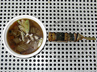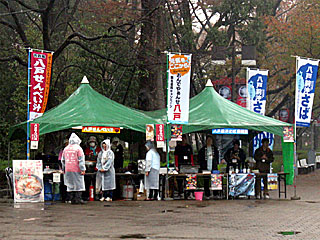日吉が丘では「 八戸復興グルメ市」と題し「 八戸せんべい汁(400円)」と「 八戸前沖さば串焼き(300円)」が販売されていました。 今日は雨の影響で非常に寒い! せんべい汁は非常に温まります。 また、サバの串焼きというのも珍しい。 両方ともウマイ! |  |  |
