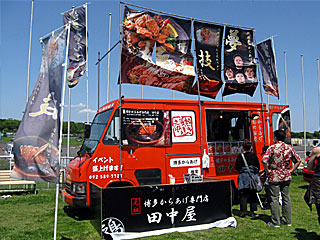 今週も フアフア広場のB級グルメ屋台は大賑わい! 今日は「 元祖博多からあげ専門店田中屋」で「 博多からあげ」(600円)をいただく。 外はカリカリ、中はジューシーな唐揚げに、甘めの特製ダレがかかっており、文句なしにウマイ! |  |  |