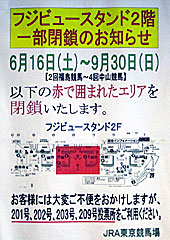 パークウインズとなった東京競馬場。 夏季は来場者も少なくなるので、 フジビュースタンド2Fの中央エリアが9/30まで閉鎖となってます。 これは例年通りですが、 昨年までは9月の中山開催から再開していましたが、今年はスプリンターズS当日の9/30まで閉鎖とのこと。 |  |  |