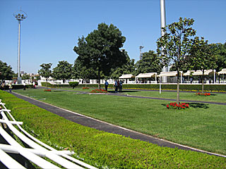 コースは右回り。1周2020m。 ゴール板の前に ウィナーズサークルがあります。 また、外側は芝コース、内側がダートコースになっており、ダートコースのゴール板のみ装飾がありました。 |