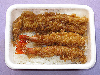 帰り際、 「てんや」でお弁当をお持ち帰り。 「 大江戸天丼」を注文。 エビ2尾とアナゴ。アナゴが大江戸をイメージさせているのかな? 味はまずまずだが、もう少しつゆだくだと嬉しかったなぁ。 |