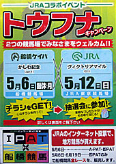 まずは トウフナキャンペーン。 5/6に船橋競馬場でもらったちらしを持参すると抽選会に参加できるというもの。 結果、ハズレ。 船橋競馬場無料入場券付きのポケットティッシュをもらう。 |