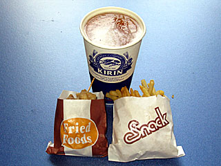 今日は非常に暑かったし、のども渇いたので、最後に ファストフードプラザにある 「鳥千」へ立ち寄る。 「 ハッピーセット」を購入。 生ビールと、一口から揚げ、フライドポテトのセット。 |
