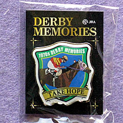 で、キャンペーンブースへ行き、まずはSTEP賞の抽選会に参加したところ、ダービーメモリーズのタケホープのピンバッジが当たった! できれば全8種コンプリートしたいと思っていたので、これは嬉しい!