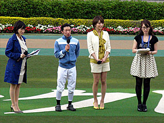 最終レース終了後、 先週に引き続き、 パドックでヴィクトリアマイルのレース回顧イベントが行われました。 司会は 細江純子、 谷桃子。 優勝した 内田博幸騎手の他、表彰式のプレゼンターも務めた 眞鍋かをりさんも参加。 |