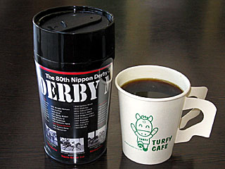 さらに、2軒となりの 「ターフィーカフェ」へ。 「 80周年記念オリジナルコーヒータンブラーセット」を購入。 日本ダービー80回記念のオリジナルタンブラーに、ホットまたアイスコーヒーが付いたセット。 コーヒーは通常270円なので、タンブラーが付いてこの値段はお得! |