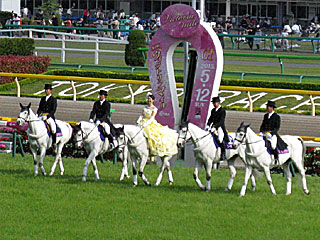 ひととおり食べまくってお腹いっぱいになったところで、レースを待つ。 ヴィクトリアマイルの 本馬場入場。 誘導馬に乗っている女性も、いつもと違ってドレスアップ。 |
