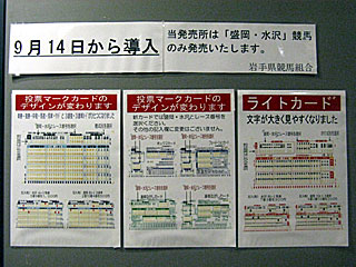 フジビュースタンド1階の 101号投票所では、 岩手競馬の場外発売所がありますが、来週 9/14より、地方競馬共通マークカードが導入されるとのことです。 これまで地方競馬は、各主催者ごとにオリジナルのマークカードを用意していましたが、経費削減を目的に、数年前から地方競馬共通デザインのマークカードが作られ、各主催者は順次この新しいマークカードに切り替えていました。 今回、岩手競馬もこの流れに乗ったものかと。 現行マークカードが見られるのも今週が最後となります。 |