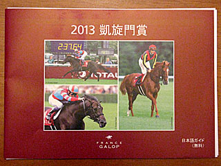 さらに入場門前にて競馬新聞を購入。 買うのは当然、 パリチュルフ( Paris Turf)。 右が仏語版、左下が英語版。 そして、何故だか日本語版も置いてありました。 といってもペラ1で、中は見開きでオルフェーヴルとキズナの写真、裏表紙は凱旋門賞の出走馬一覧を掲載しているだけのもの。 |
