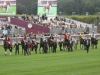 そして5R。第92回 凱旋門賞。芝2400m。 出走馬が本馬場に登場。 ちなみに人気の一角を担うはずだった ノヴェリスト( Novellist)が取り消したため、今年の出走馬は17頭。 オルフェーヴルは8枠6番、 キズナは11枠14番です。 |