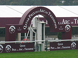ロンシャン競馬場には、スタンド前にゴール板が2つあり、距離によって使用するゴール板が異なります。 右画像は凱旋門賞でも使用するメインとなる第1ゴール板。 直線の長さは約533m。 |