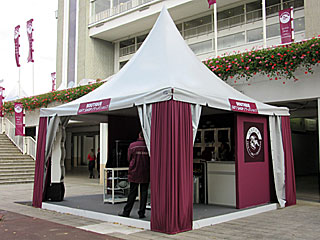 明日の凱旋門賞当日は混雑必至のため、おみやげグッズ類は今日見てみることに。 場内にいくつか出店しているギフトショップのテントを覗いてみる。 けど、特に欲しいというものは見当たらなかった。 しかも、どれもこれも高過ぎ! |