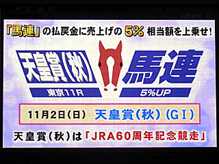 ちなみにJRA60周年記念競走ということで、天皇賞秋の馬連のみ、払戻金に売上の5%相当が上乗せされる「 天皇賞秋馬連」が実施されました。 また、東京競馬場の一部の発売機にて、JRA60周年記念馬券の発券も行われました。 |