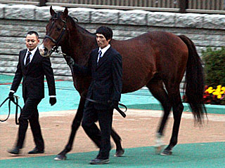 さて、 昨日に引き続き、今日も2007年の天皇賞馬 メイショウサムソンの展示が行われました。 まずは朝9:10より パドックにて。 |