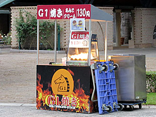 | 東京競馬場グルメインフォメーション| お店: | GⅠ焼き(じーわんやき) | | 場所: | パドック日本庭園側 | | 詳細: | | | 注文: | GⅠ焼きマロンクリーム | | 値段: | 160円 |