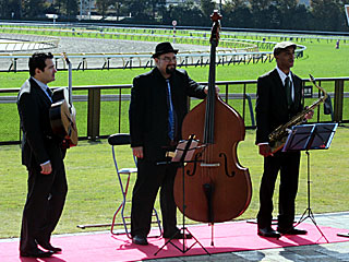 毎週日曜日に行われている「 世界のJAZZで競馬を優雅に楽しもう」。 先週は雨で屋内での演奏でしたが、今日は天気も良く、 西門入口付近に赤絨毯が敷かれ、そこで定期的に演奏が行われていました。 |