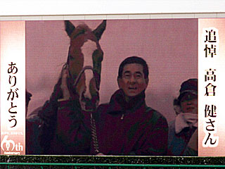 現在、 イーストホール3Fおよびターフビジョンにて「 JRA60周年記念懐かしのメモリアルCMリバイバル放映」が実施されています。 それらのCMのうち、1992年と1993年は 高倉健さんが出演されていましたが、先日、 高倉健さんが今月10日に亡くなっていたことが発表されたことから、JRAでも 高倉健さんのCMを流しつつ、追悼のメッセージも添えられていました。 |