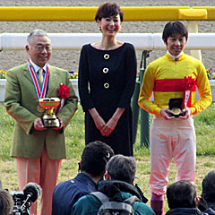 その後の表彰式。 馬主の ドクターコパこと 小林祥晃さん、 武豊騎手に加え、本日、プレゼンターとして来場した女優の 田丸麻紀さんによる3ショット。 |