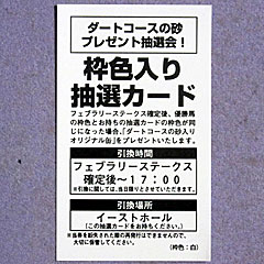 まずは イーストホールへ行き「 ダートコースの砂プレゼント抽選会」に参加。 フェブラリーSの馬券500円分を提示すると、枠色カードがランダムで1枚もらえ、フェブラリーS優勝馬と同枠のカードを持っていれば当たり。 東京競馬場のダートの砂がもらえるというもの。 で、自分がもらったのは1枠白色。 結果を言うとハズレ… |