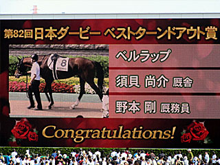 その後、ターフビジョンで ベストターンドアウト賞の発表。 2013年の日本ダービーで初めて導入され、今年で3回目。 今年は 須貝尚介厩舎の 野本剛厩務員が担当する ベルラップが受賞。 昨年は ワンアンドオンリーが受賞し、そのままダービーも優勝しましたが、果たして今年の結果は? |