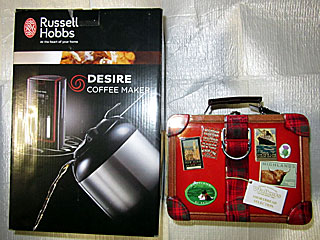 さて、 マリアライトは6枠12番ってことで、なんだか ジャパンオータムインターナショナルプレミアム抽選に当たってしまった! とりあえず当たったのはクッキーが入った「 英国ウォーカースーツケース缶」だが、さらにガラガラポンを回すとWチャンス賞も当たってしまう! 「 ラッセルホブスデザイアコーヒーメーカー」。ビックリ! |