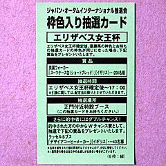 今日の エリザベス女王杯から4週間、マイルCS、ジャパンカップ、チャンピオンズCの4レースは「 ジャパンオータムインターナショナル」と位置づけられてます。 で、シリーズを盛り上げる意味も込めて、毎年恒例の「 ジャパンオータムインターナショナルプレミアム抽選会」が行われました。 9:30より、当日購入の馬券1000円分を提示した先着1600人に、枠色カード(8色×200枚)をランダムで1枚配布。 エリザベス女王杯勝ち馬と同じ枠色のカードを持っている人に賞品が当たるというもの。 自分も朝イチで行き、もらったのは6枠緑。 結果やいかに… |