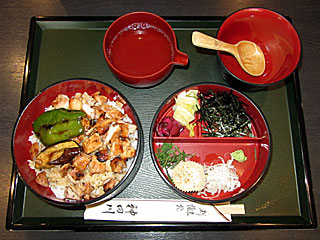 そして昼メシは レストランプラザの 「神田川」へ。 「 キジ焼ひつまぶし」を注文。 鶏肉のキジ焼き、ピーマン、そしてナス… 最近、嫌いなのにナス食が多い… で、ナスを抜かせば、まずまずおいしい。 |
