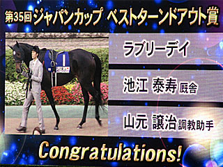 その後、ターフビジョンで「 ベストターンドアウト賞」が発表されました。 受賞したのは1番人気にも支持されている ラブリーデイ。 |