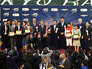 そして、いよいよ ジャパンカップの発走。 レースは独の イトウが逃げるかと思いきや、 カレンミロティックが大逃げに打って出る展開。直線に向くと横並びに争いになりましたが、内から7番人気 ラストインパクトが抜け出しを図るも、外から1番人気 ラブリーデイが迫り、さらに外から4番人気 ショウナンパンドラが交わして優勝! ショウナンパンドラは 昨年の秋華賞に続きGⅠ2勝目。 ディープインパクト産駒で、鞍上は 池添謙一騎手。 |