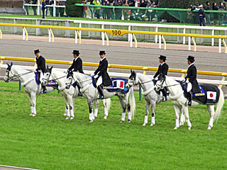 ジャパンカップ本馬場入場。 先導するのは5頭の誘導馬。 ゼッケンには出走馬の国旗が描かれていましたが、昔は騎乗者が国旗を持って入場するなど、もっと華やかだった気がする… |