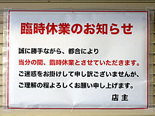 フジビュースタンド4Fにある 「むぎんぼう」が、なにやら臨時休業とのこと。 ネットで調べてみると、JC週になんかボヤ騒ぎがあったらしく、それ以降、休業しているとのこと。 気付かなかった… |  |  |