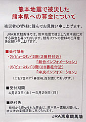 4/14 21:26に、熊本県で最大深度7を観測する地震が発生。 さらに2日後の4/16 1:25にも、同じく最大深度7を観測する地震が発生! 熊本県や大分県では甚大な被害が発生し「 平成28年熊本地震」と命名されました。 熊本県にあるウインズ八代は先週、今週と閉鎖され、競馬界にも影響が出ています。 そして今週から、熊本地震の募金がJRA各施設で始まりました。 また、最終レース終了後、ジョッキーによる募金活動も行われました。 |