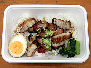 その後、昨日に引き続き 内馬場の「 メガグルメフェスティバル」へ。 せっかくなので「 Porky&Ducky's」という店で「 蜜汁チャーシュー飯」800円。 香港でよくみかける鶏飯ってことだが、確かにそれを上品にした感じでおいしい。 |  |  |